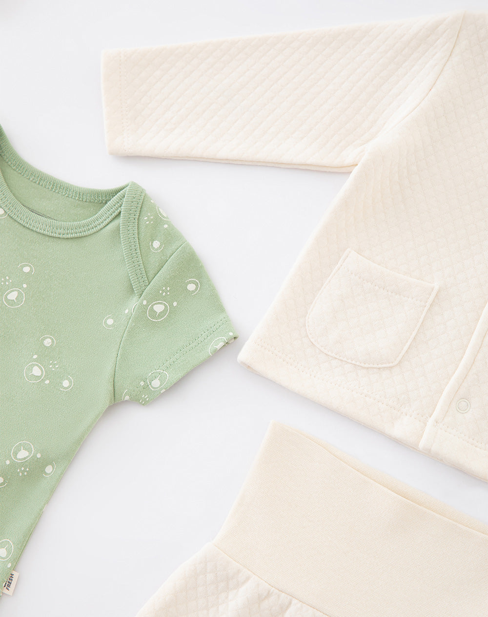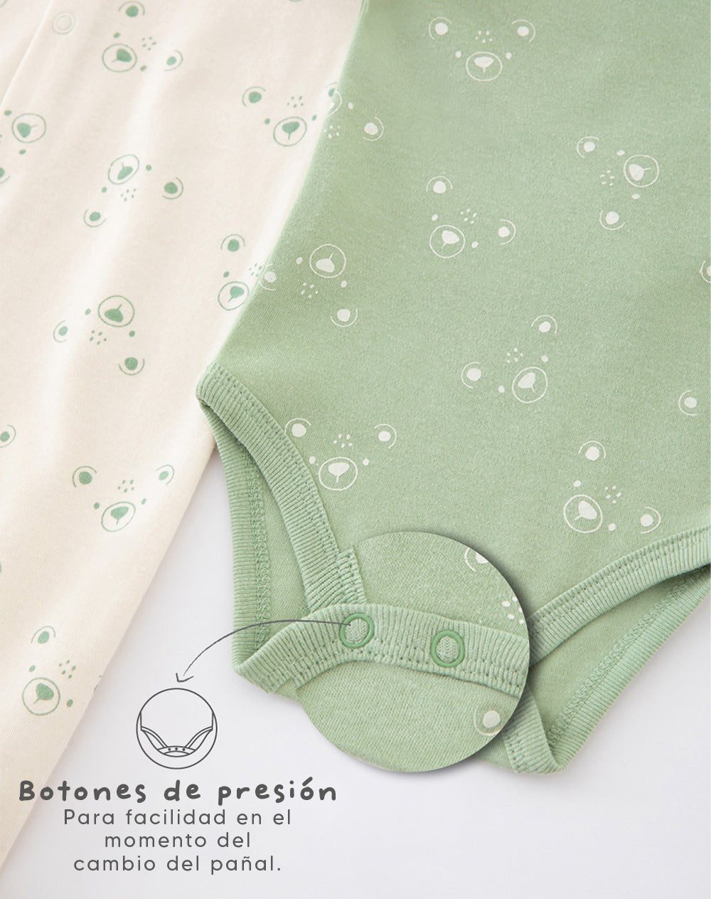 • Body con cuello redondo manga corta hombro adelantado el cual permite vestir y desvestir más fáci l al bebe y botones de presión en entrepierna para mayor facilidad al vestir