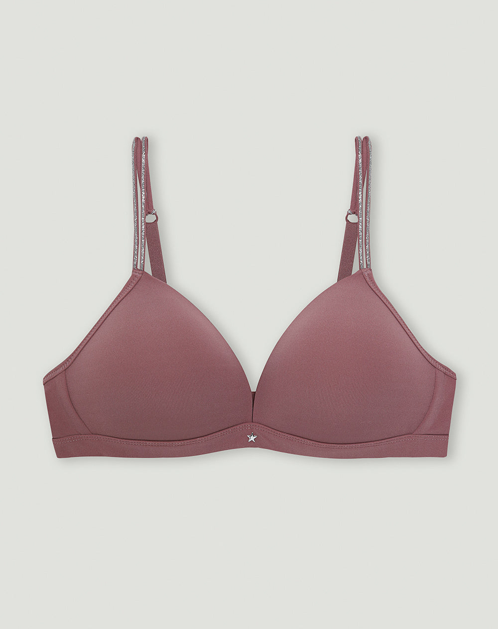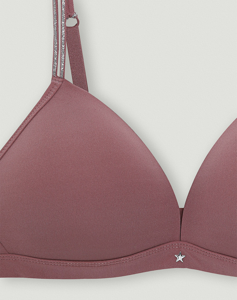 Diseñado para ofrecer comodidad y soporte medio. Cuenta con base amplia que aporta estabilidad. Las copas son ligeras, sin realce adicional, para un ajuste natural y suave al cuerpo. Las cargaderas delgadas incluyen un toque de brillo en la parte frontal como detalle visual. En la espalda, son regulables y cruzables, lo que permite adaptarlas a diferentes estilos de uso. Se abrocha en la parte trasera con un sistema de cuatro posiciones, que permite personalizar el ajuste. Elaborado en jersey (tejido suave y liviano de superficie lisa que se ajusta al cuerpo), pensado para brindar confort con libertad de movimiento.