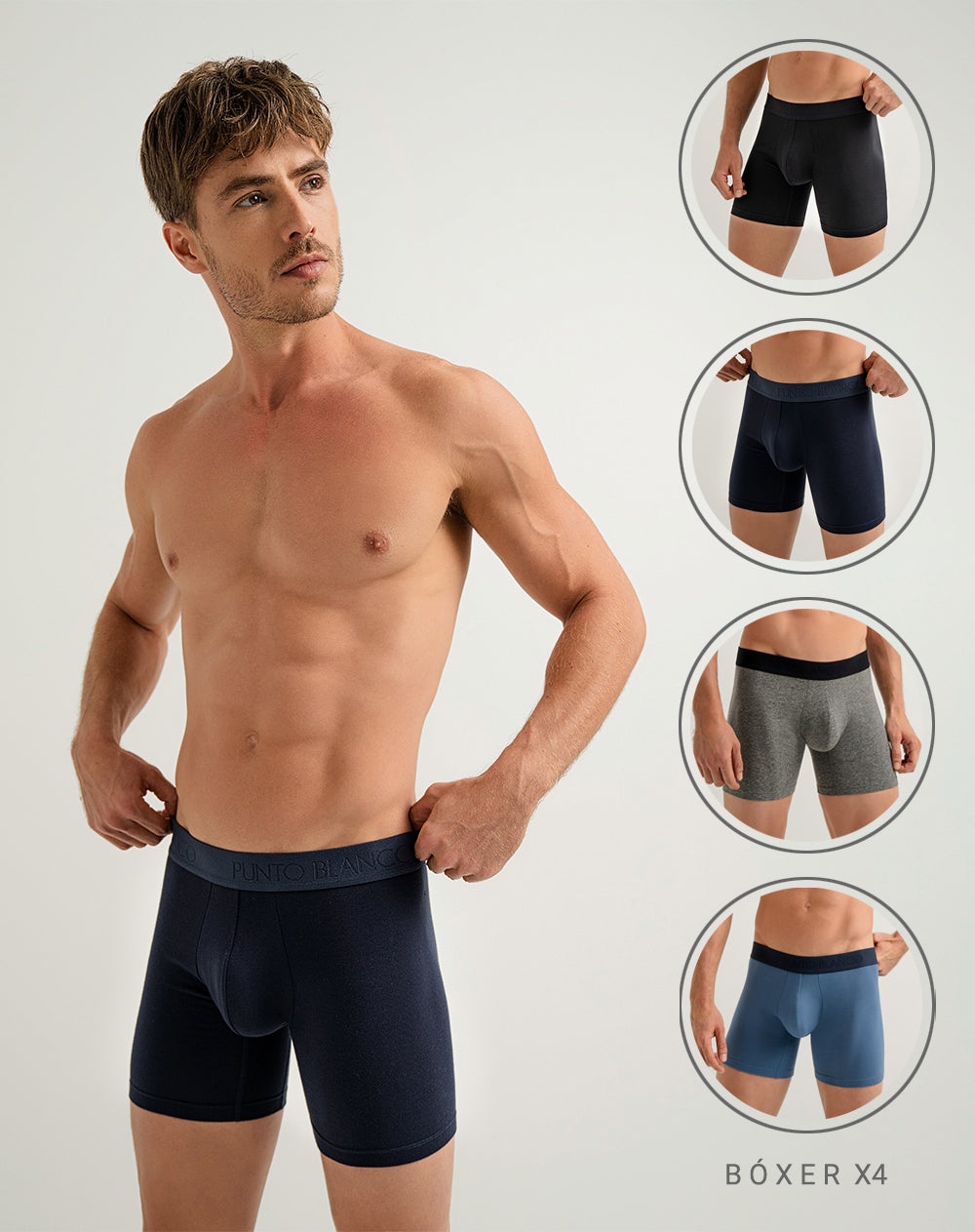 Bóxer medio – Paquete x4 Diseñado para acompañarte en el día a día con comodidad y ajuste natural. Este bóxer medio está confeccionado en jersey elástico de algodón (fibra natural), una tela opaca, suave y ajustable que se adapta al cuerpo con frescura y confort. Gracias a su acabado con suavizantes (que no alteran las fibras), conserva las propiedades de absorción y control de humedad, manteniéndote seco por más tiempo. Incorpora una panel amplio (mayor espacio y comodidad) y un elástico expuesto contramarcado de 4 cm, que ofrece un ajuste firme. |